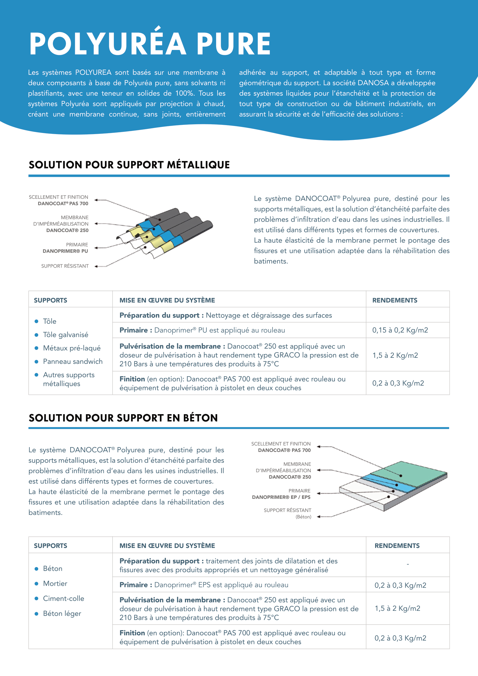La solution POLYUREA peut s’adapter sur un support en béton ou métallique. Également utilisée dans le traitement des bassins d’eau potable et piscine (dispose du certificat de contact avec les aliments et eau potable).