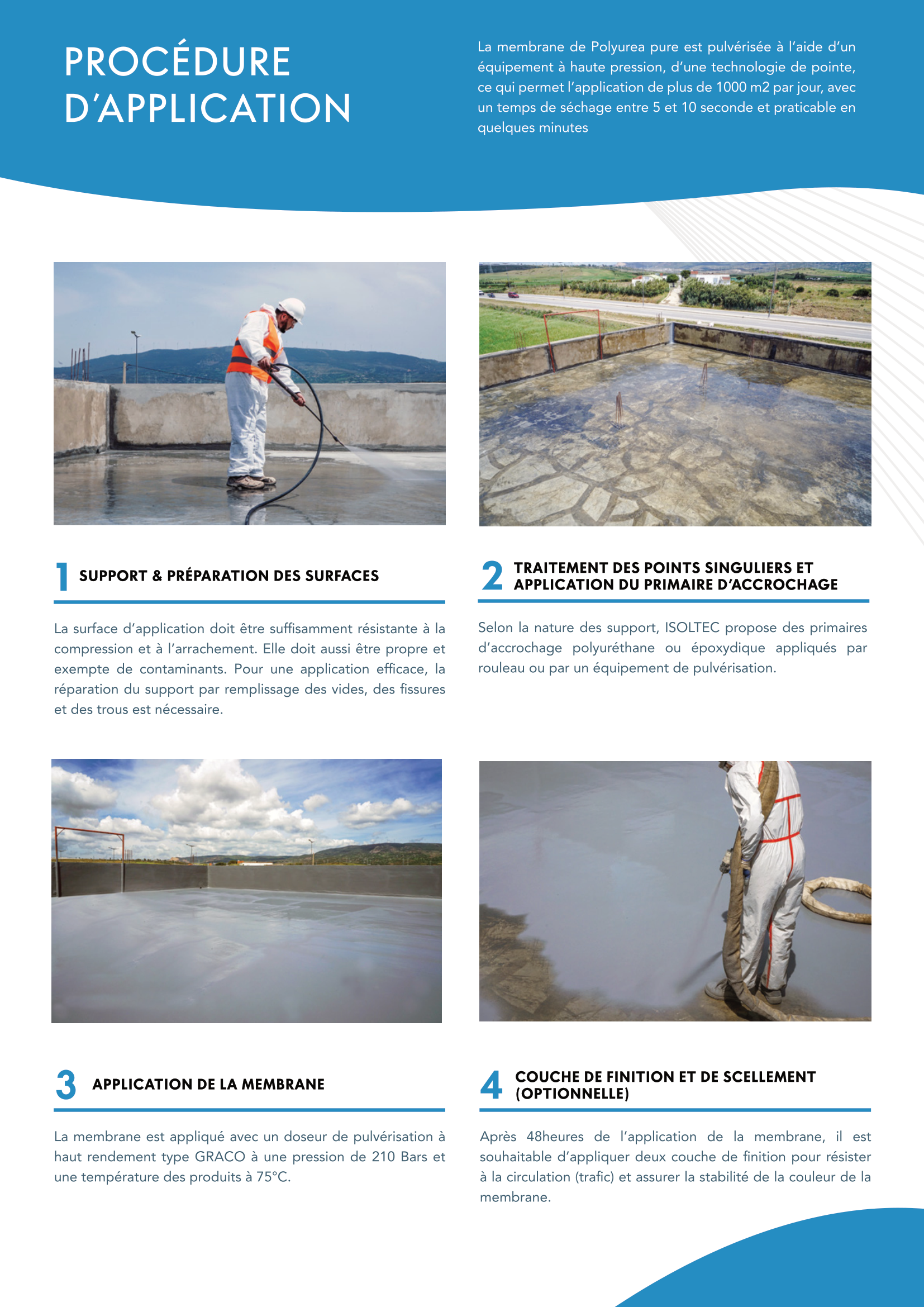 ISOLTEC met à disposition de ses clients une solution innovante d’étanchéité liquide POLYUREA pure appliquée par projection à chaud et à haute pression qui épouse toutes les formes géométriques.